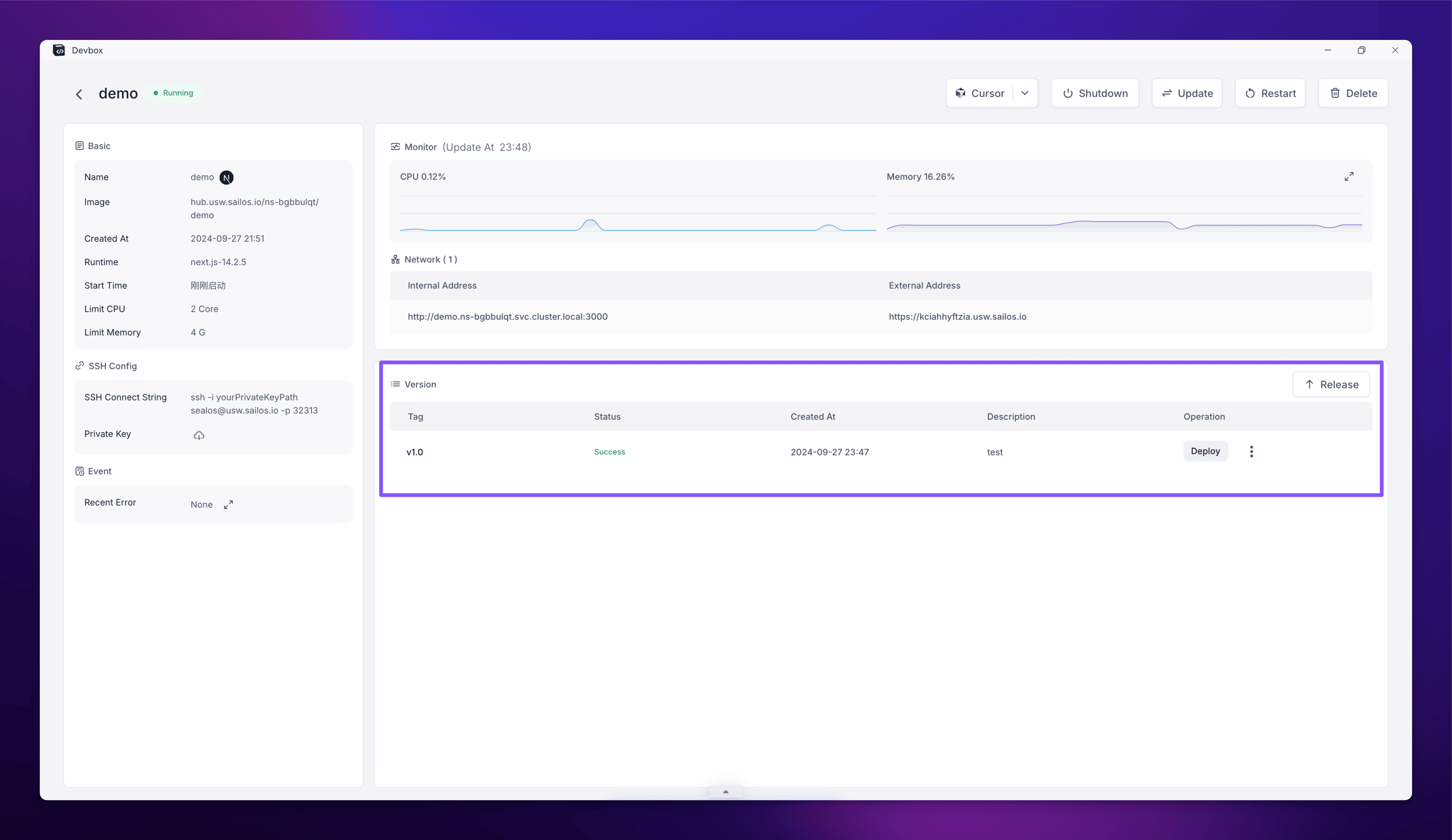 The system will process your release. Once completed, you'll see a new entry in the "Version" section of your project details page, showing the tag, status, creation time, and description of your release.